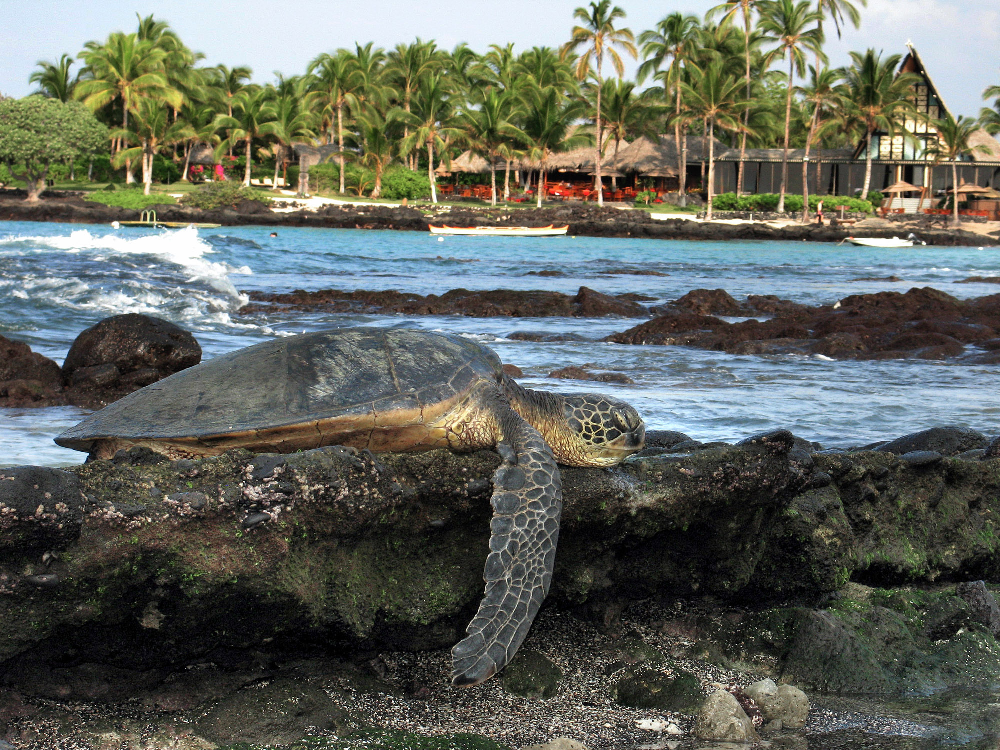 Lazy honu finds a good shelf for an afternoon nap at the Kona Village on the Big Island of Hawaii. (Photo/Dick Schmidt)