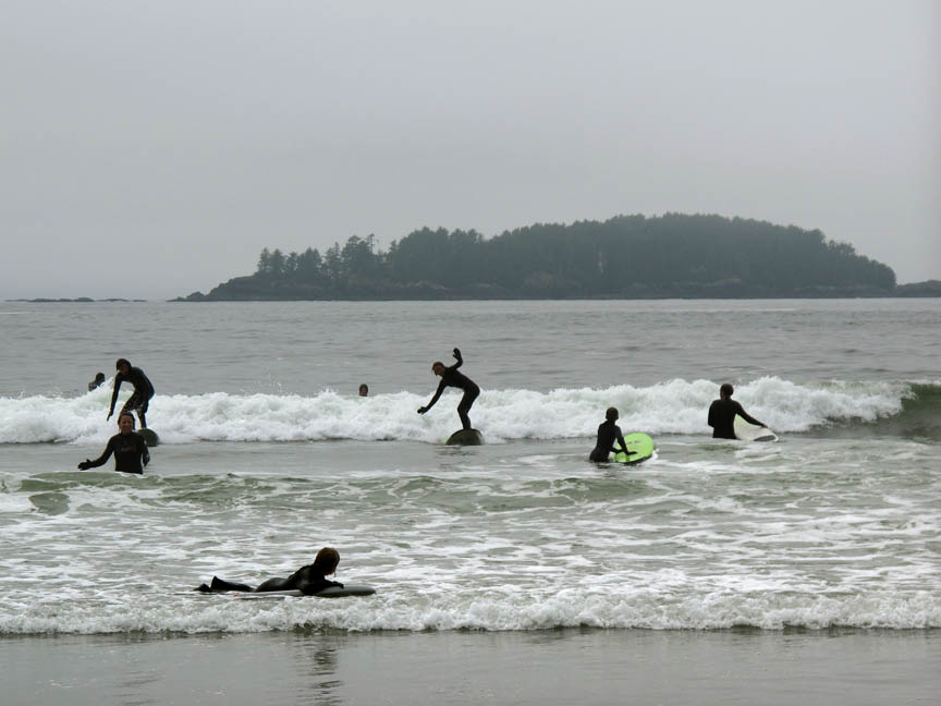 This is not to say that West Coast surfers (which is what they call themselves in Tofino) are weenies. Far from it. But most of the ones we saw were definitely beginners. There was a lot of sitting and stomach paddling. And when one brave penguin tried to rise to his or her feet on a board, it was a quick up-and-down move.