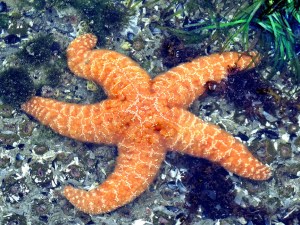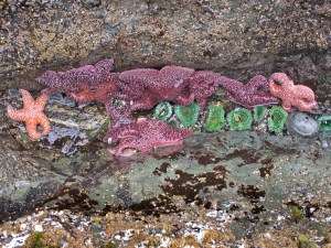 One seastar arm tossed across another seastar’s back, orange over plum-coloured, mashed onto rocks so tightly you couldn’t pry them off with tire irons. Not that you’d want to. (Though we did find dead, dried-out stars on a log in Campbell River. They didn’t get there on their own, I’m afraid.) They’re so pretty in their natural habitat. I petted a couple of star backs, but they don’t react like anemones. They play possum really well, sleeping on like contented puppies with full bellies.