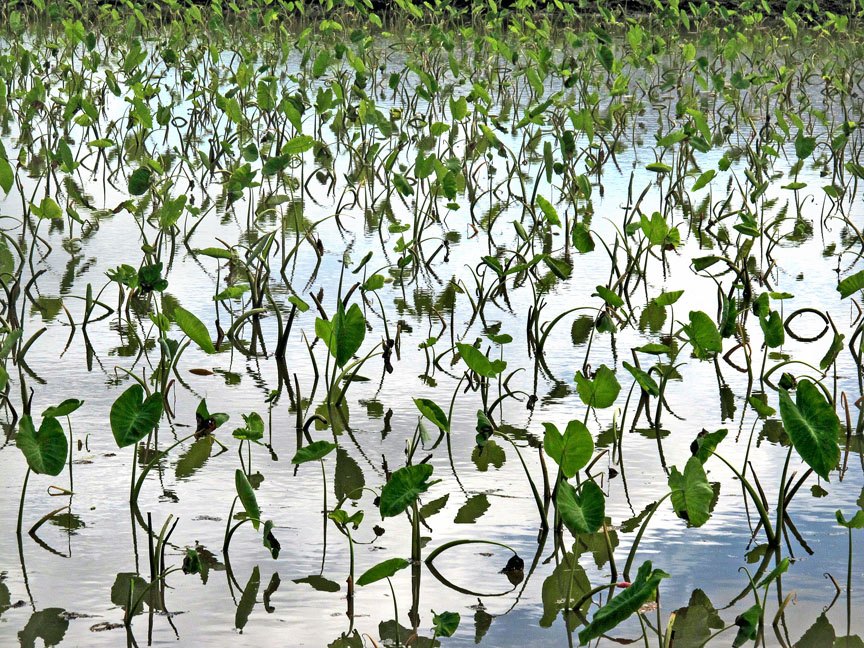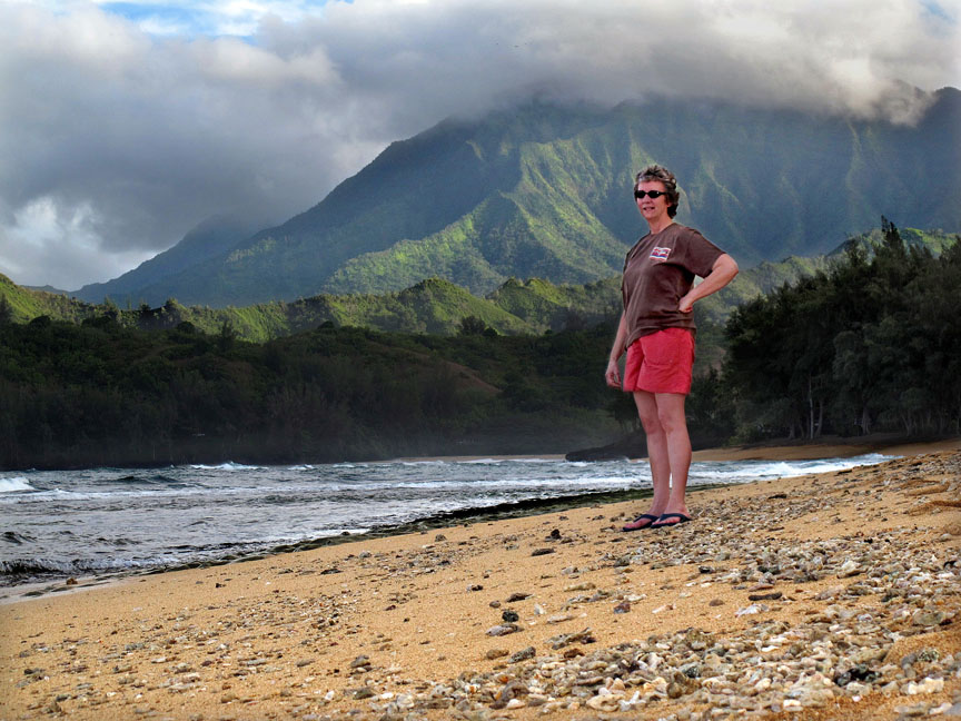 We drove around the two-thirds of island you can drive here, looking for sun. Hanalei on the north shore seems always to be drippy—it’s what makes it beautiful, when the clouds hang low over the rim of mountains behind the town and gorgeous bay. Lihue, the main town, lay under cloudy gray, damp skies. Poipu, the “sunny” south shore—ditto. Only when we drove up the mountain to the often drenched Waimea Canyon (“Grand Canyon of the Pacific,” Mark Twain allegedly said), did the sun peek out a wee bit amid the passing clouds, parting like white curtains to reveal glimpses of dramatic red rock.