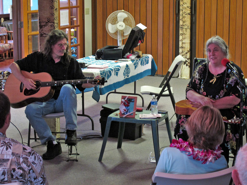 Yesterday we went to an afternoon slack key guitar concert put on by Doug and Sandy McMaster in Hanalei. They perform twice a week here, very informally. Doug is the slack key guitar master, and Sandy talks story and strums a ukulele. If you walked in wound up about anything, within ten minutes of listening, you’re a wet noodle. You leave your shoes or sandals at the door, as people do in Hawaii, wander in to find a folding chair, and settle in for a lovely couple of hours in your bare feet.