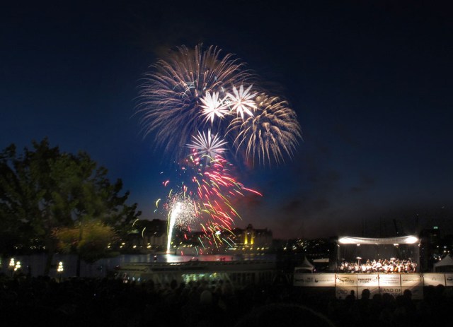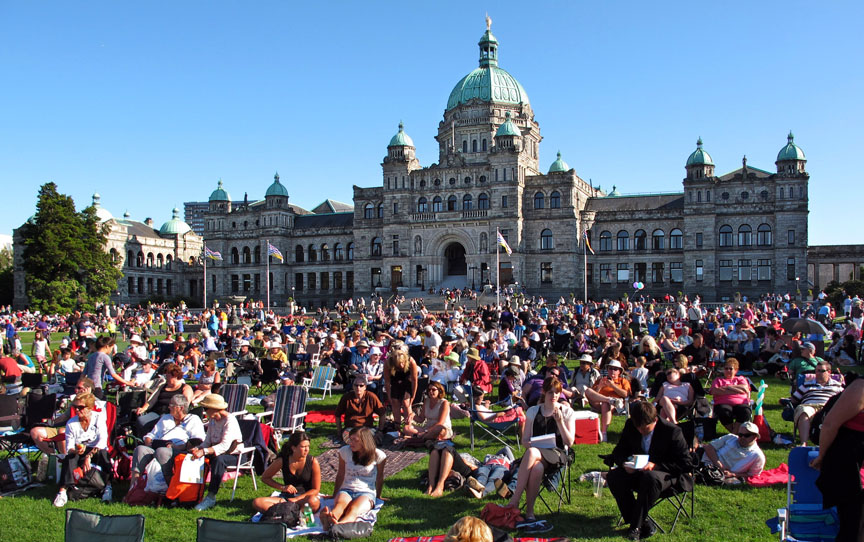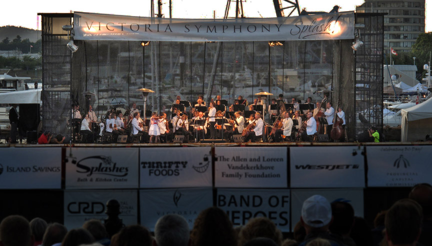 Imagine 40,000 people gathering outdoors around Victoria’s Inner Harbour to watch the diminutive Victoria Symphony play their hearts out (all 54 of them–I counted) under the direction of a small woman on a barge, for heaven’s sake. They’ve done this for 21 years in what has to be one of the biggest outdoor concerts on the West Coast of this continent. Rock concerts don’t generally attract that many people.