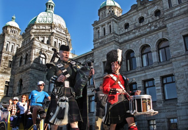The Canadian Scottish Regiment Pipe and Drum Band with Victoria Symphony conductor Tania Miller in pedicab.