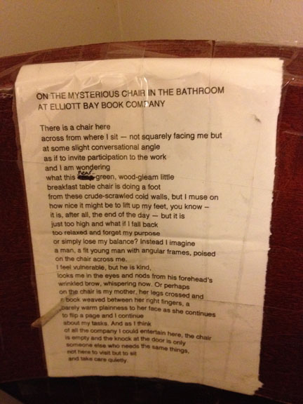 We also hung out in the new (to me, anyway) Elliott Bay Books, which, when I was last there, was (hello!) by Elliott Bay. It is now up on 10th Avenue, which makes it harder for tourists like me to find, on a not very snazzy block in what looks to be an old warehouse, but oh, it’s nice inside–very roomy and a poetry section that is three stacks wide. I love me a deep poetry section. It is also the only bookstore I’ve ever seen where someone has taped a typed poem to the back of a chair in the bathroom. You can sit or stand and read the poem, as I did.