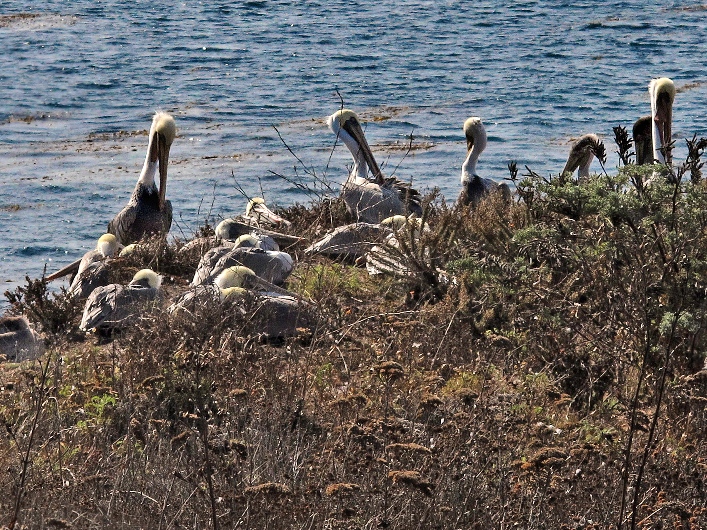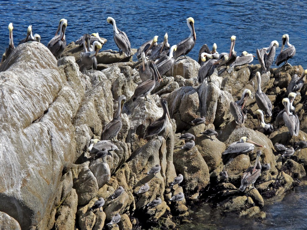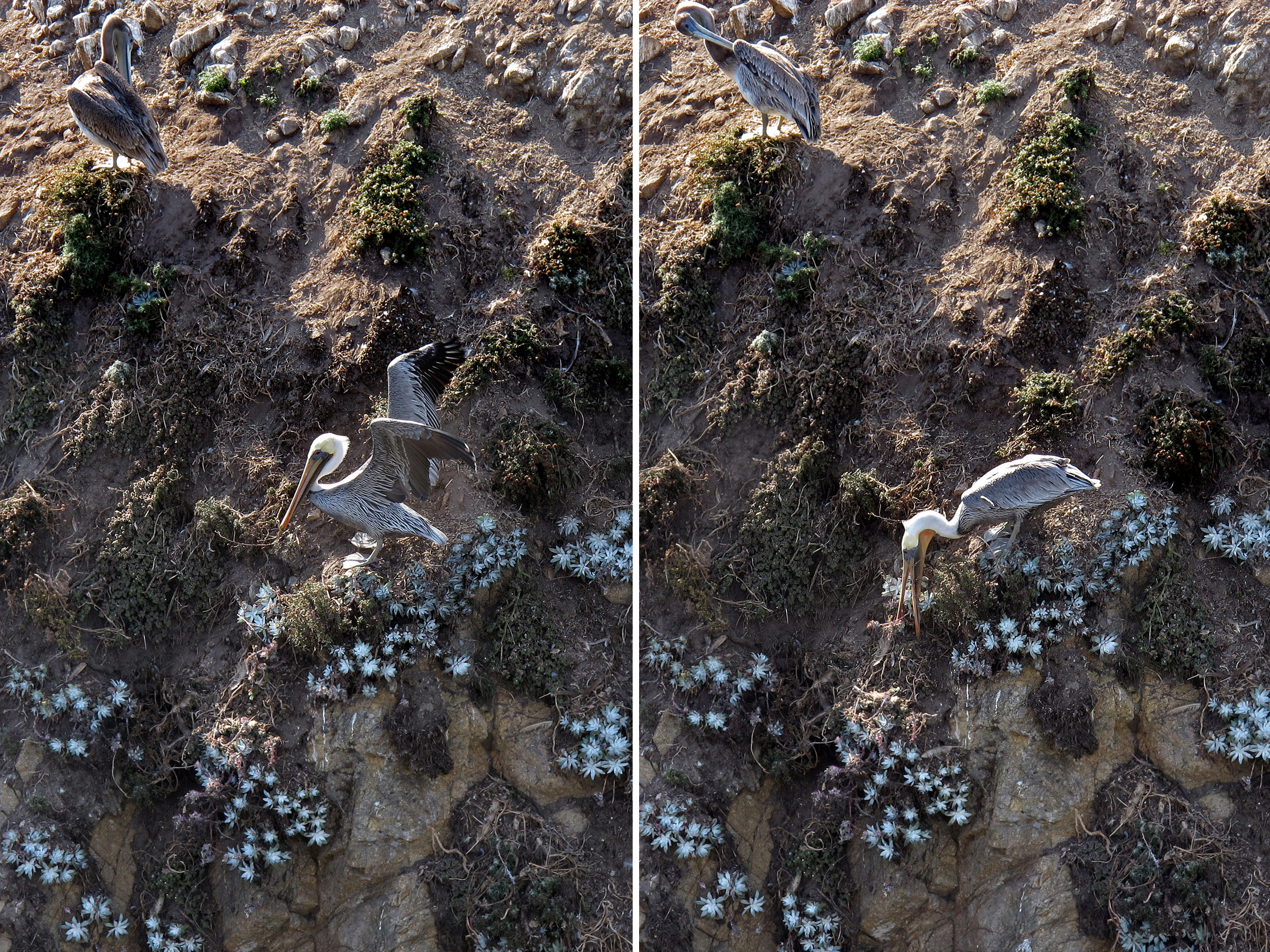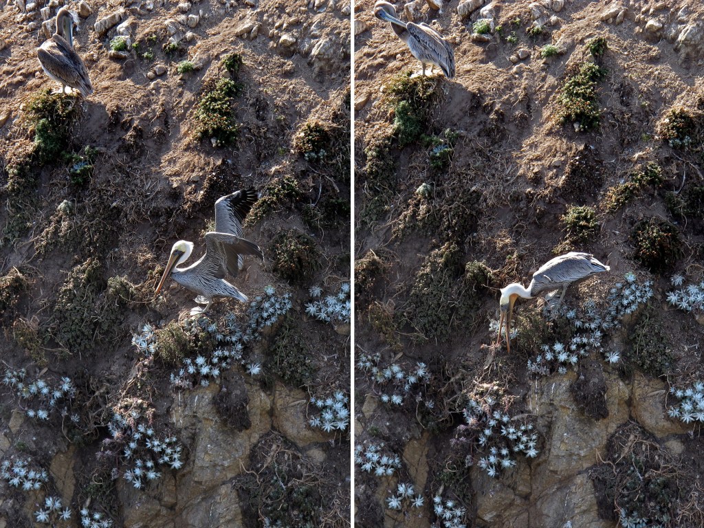 And despite the awkward, rocky terrain, some particularly well-balanced pelicans manage to find purchase in places only experienced rock-climbing humans could.