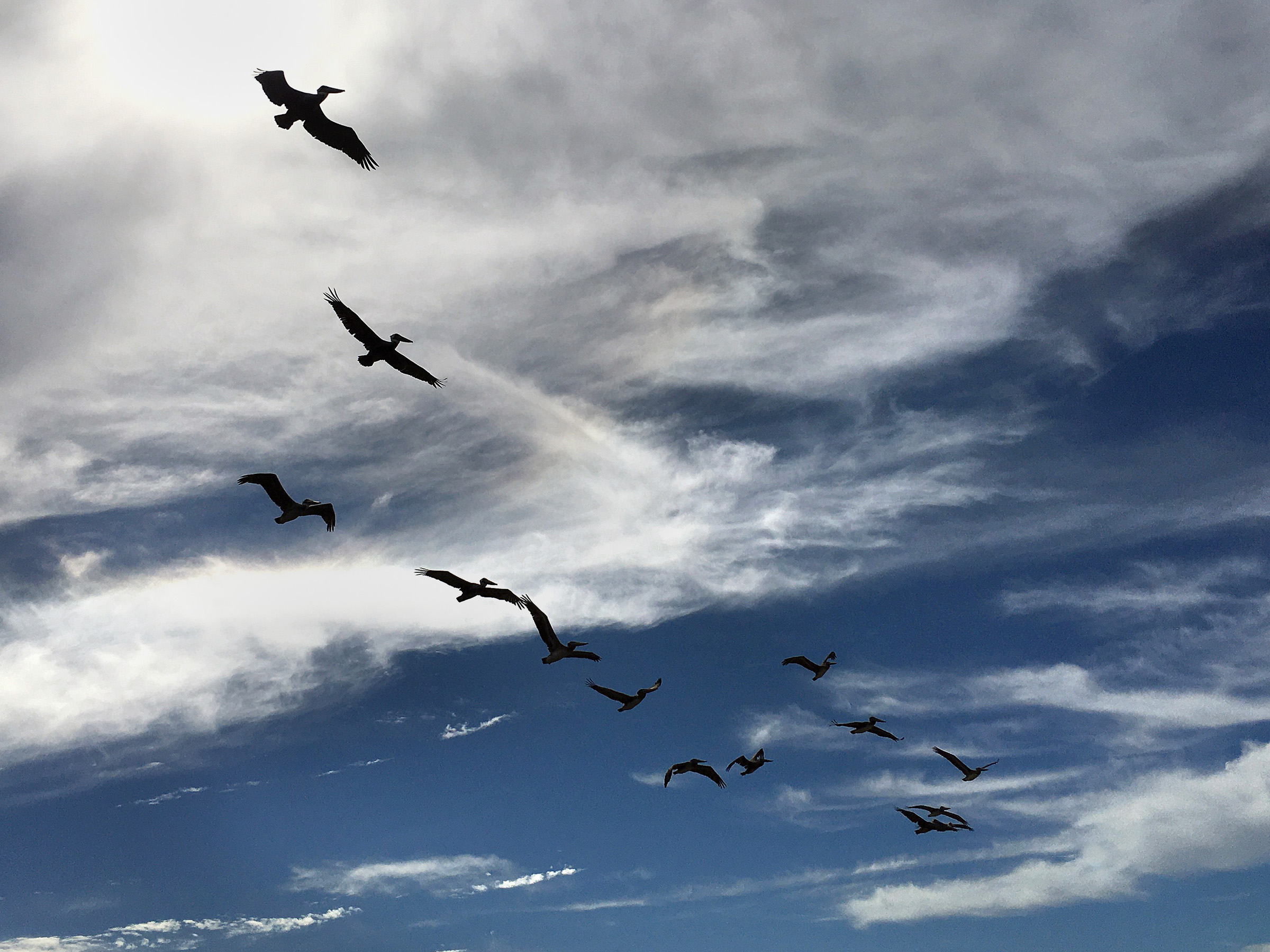 Dozens of pelicans roosting in cypress trees—as birds do, of course—but how funny to see these sizable birds decorating the greenery. Though many of us imagine that they use their voluminous pouches to carry fish, they don’t. They cruise 60 to 70 feet over the ocean, spot schools of fish, then dive-bomb the water, scoop up their fish, and let the water drain out of their porous pouches before they swallow. If they’re caring for young ones, like other birds, after they return from hunting, they regurgitate part of their meal for the babies.