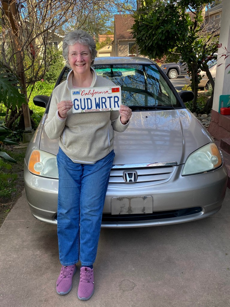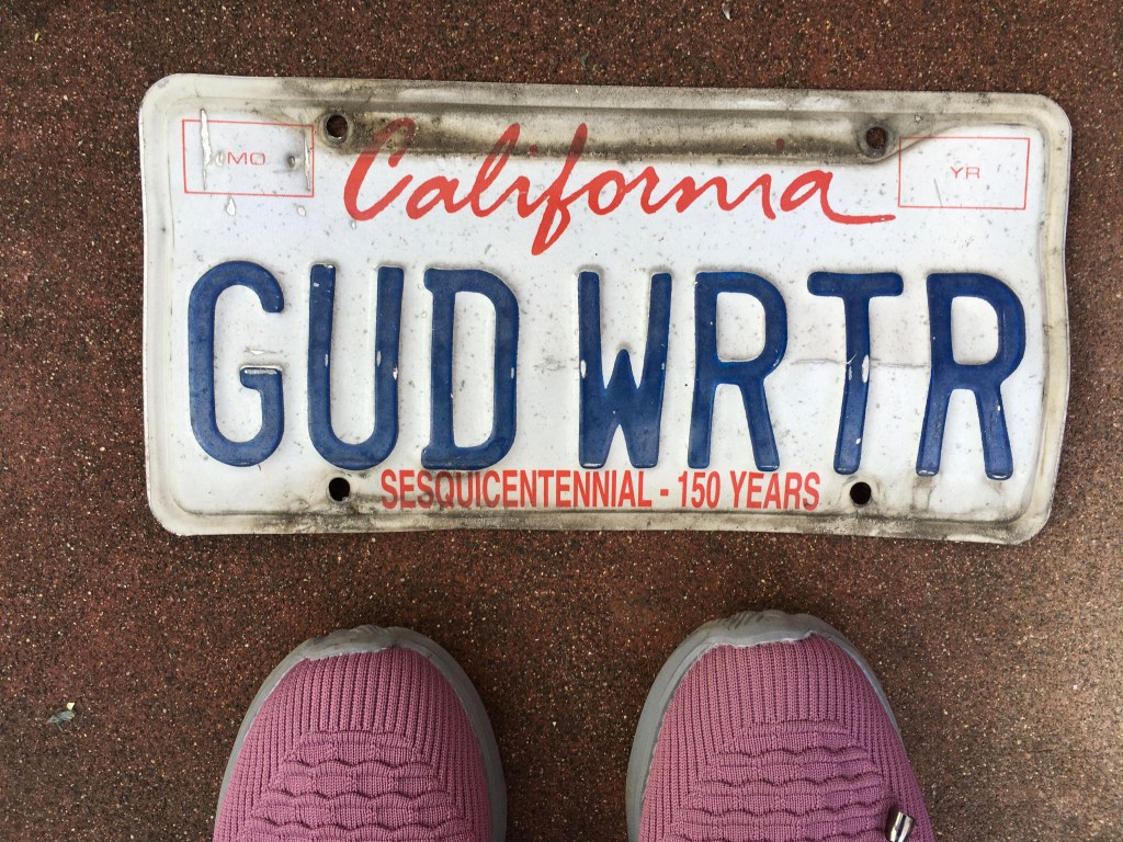 I’d never imagined myself a personalized license plate kind of person, but when we happened upon the DMV booth at the fair, Georgann decided that I was. I don’t recall exactly how she came up with that particular letter combination, but right then and there a DMV employee checked a database (it’s possible that it was in a large binder of many printed pages), and it turned out that for a mere $30 registration fee, GÜD WRTR could be mine. They couldn’t put the umlaut over the “u,” but Georgann pointed out that we’d know it was there.