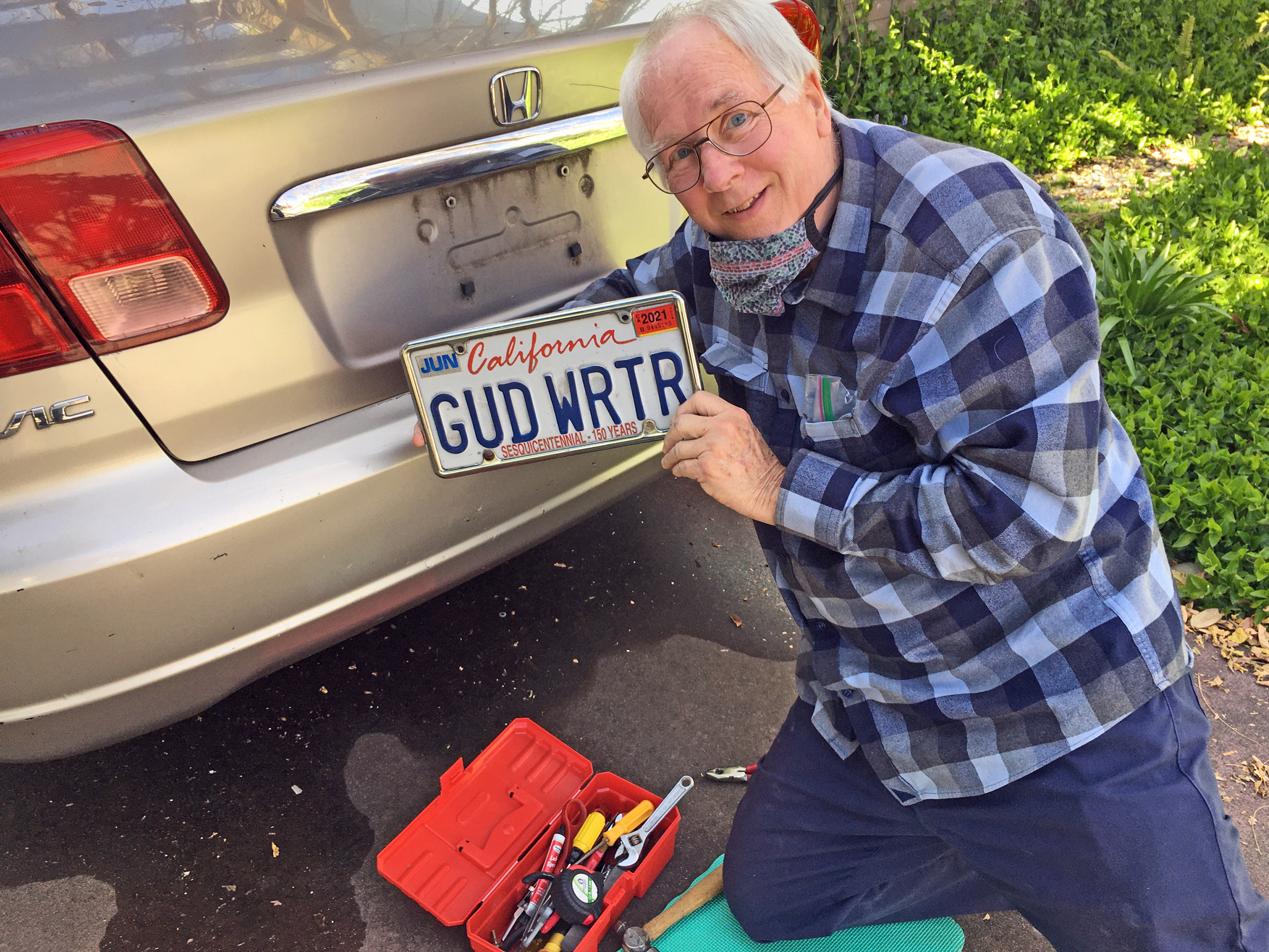 The day before the tow truck arrived, Dick, with his trusty little red toolbox, knelt on the driveway and removed the GÜD WRTR plates he’d affixed there so long ago. He has been my rock and ace cheerleader in all things, and I am grateful to him. The license plates were mine to keep, said the nice woman on the phone with whom I arranged the donation.