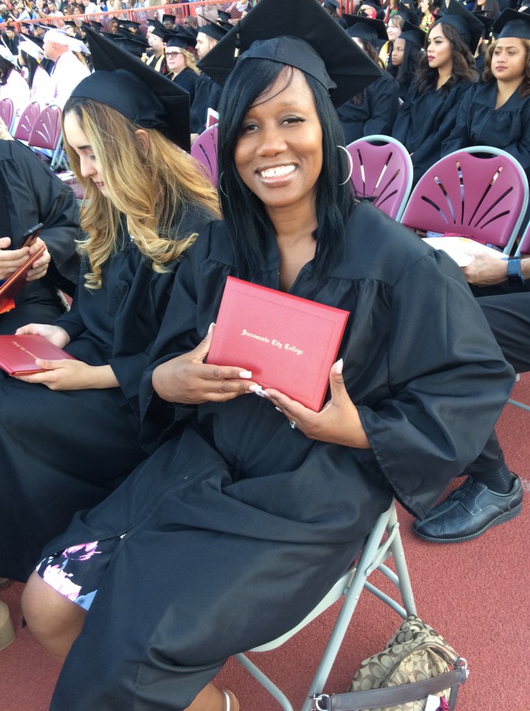 So I learned that instead of gowning up, I could volunteer with other staffers to don a burgundy polo shirt embroidered with Sacramento City College in gold and help graduates in the gym  figure out how to put on their regalia (another fancy word for “outfit,” I told many of them), including special gold or red, white and blue cords to indicate different honors, and bobby pin their caps to hairdos certain to be smashed by them.