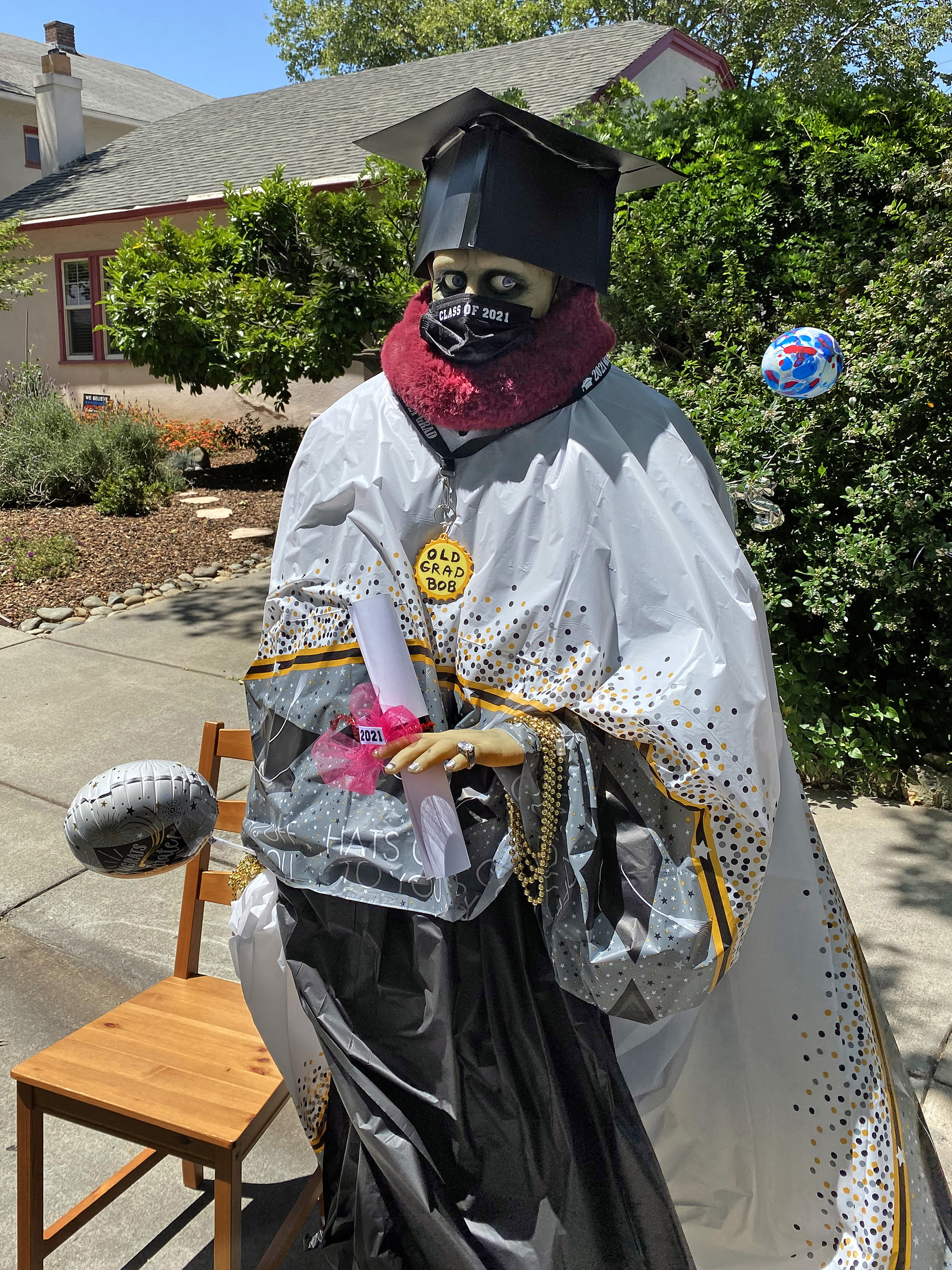 Christine added more graduation decorations and set five folding chairs at the curb, each with a silhouette of a graduate and that graduate’s name on it. She dressed up her 6-foot-tall manikin (formerly The Man, lately Old Bob) in his own cap and gown.