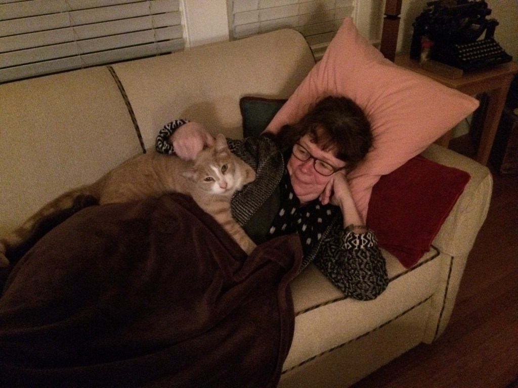 I couldn’t do much for you, especially since you slept 20ish hours of every day, either in bed or on the sofa. You could barely walk. You’d fallen more than once. You looked skeletal to me, and, in fact, we learned, you’d lost 15 pounds in a month. But you were so glad to see me. Had a couple of gifts for me that you’d ordered online—kitty socks and a striped top with a big cat on it.