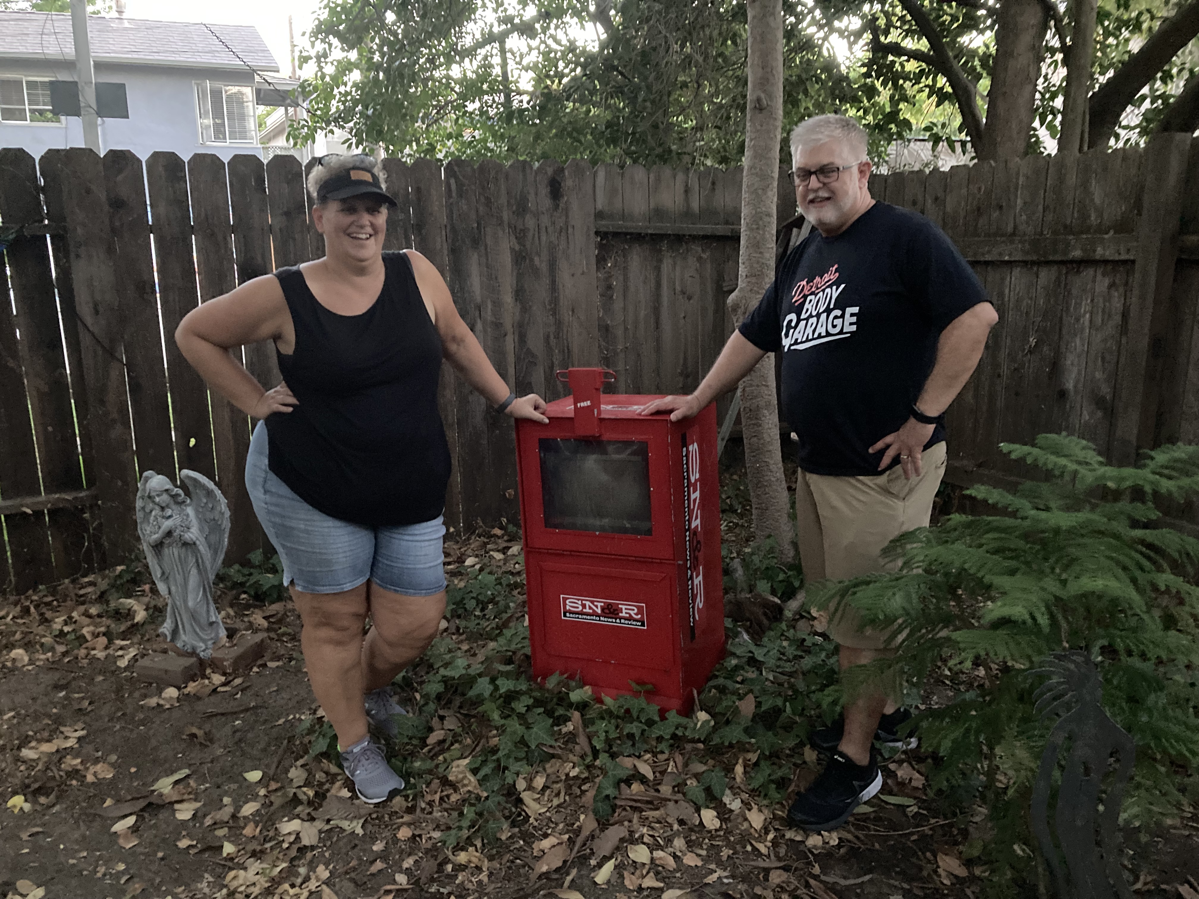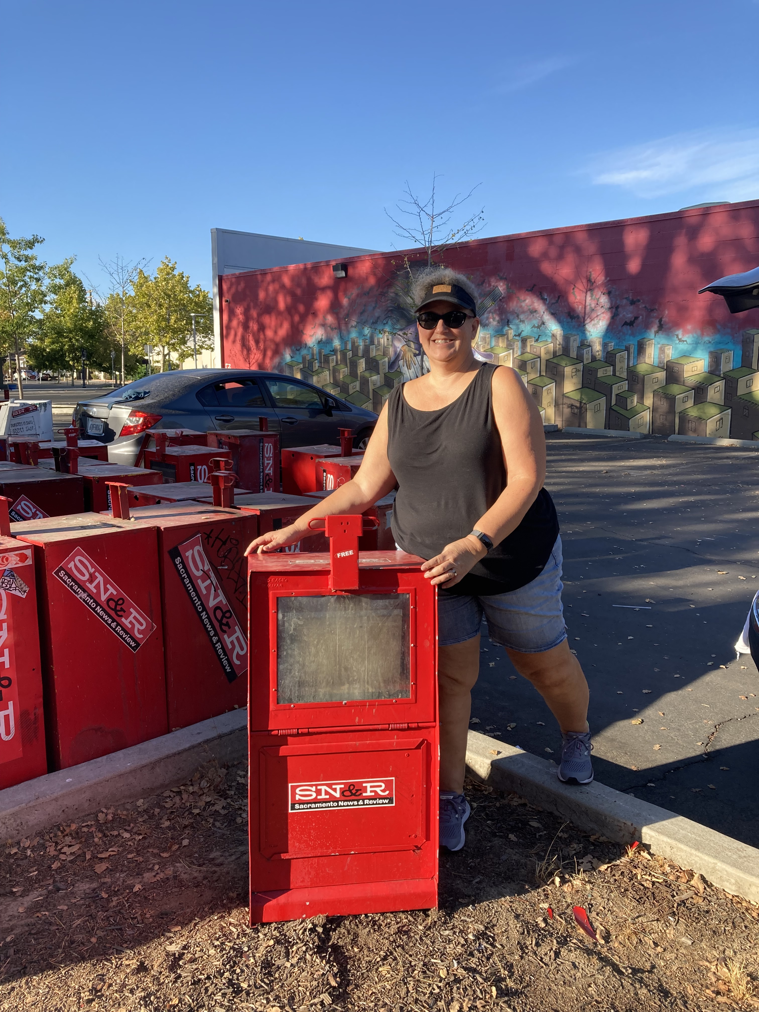 Well, I got my chance on the 20th anniversary of 9-11, a somber day for sure. That’s when I learned that the Sacramento News & Review was giving away its newspaper boxes. Bring a vehicle to their parking lot and pick one up. They had a number of them that had been painted by artists, but by the time I arranged with my friend Timi Poeppelman to drive me over in her SUV, those were mostly gone.