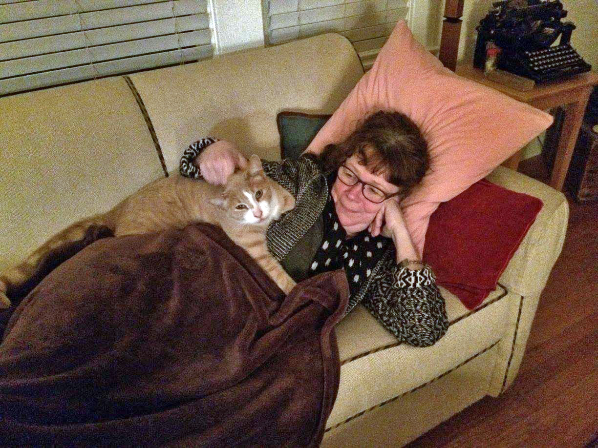 Never one to pass up the opportunity to take advantage of a warm blanket and person, Diego and Georgann rested together for a while that afternoon and evening. She, a kitty person, too, accepted Diego’s love (and enormous purr) as the great compliment it was and is. (And it is great—he’s a whopping 15-pounder of feline.)