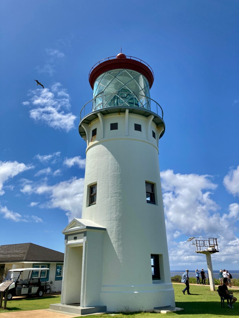 But the other reason you go to the lighthouse is to watch seabirds flying like white kites over the impossibly blueblue ocean—the red-footed boobies (yep, their real name with their goofy scarlet footwear); the white- and red-tailed tropicbirds with their streamer-like tails; the wedge-tailed shearwaters tucked into their earthen nests in the hills around the lighthouse, and the ginormous Laysan albatross with “wingspan(s) as wide as Kobe Bryant [was] tall,” according to Hob Osterlund’s fine book, “Holy Moli” (the Hawaiian word for “albatross”).