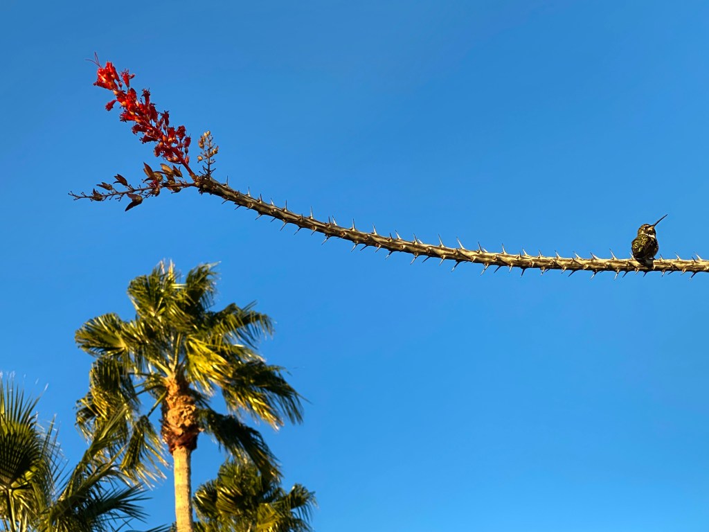 Hummingbird on Ocotillo branch, Ocotillo Lodge, Palm Springs / Photo by Dick Schmidt