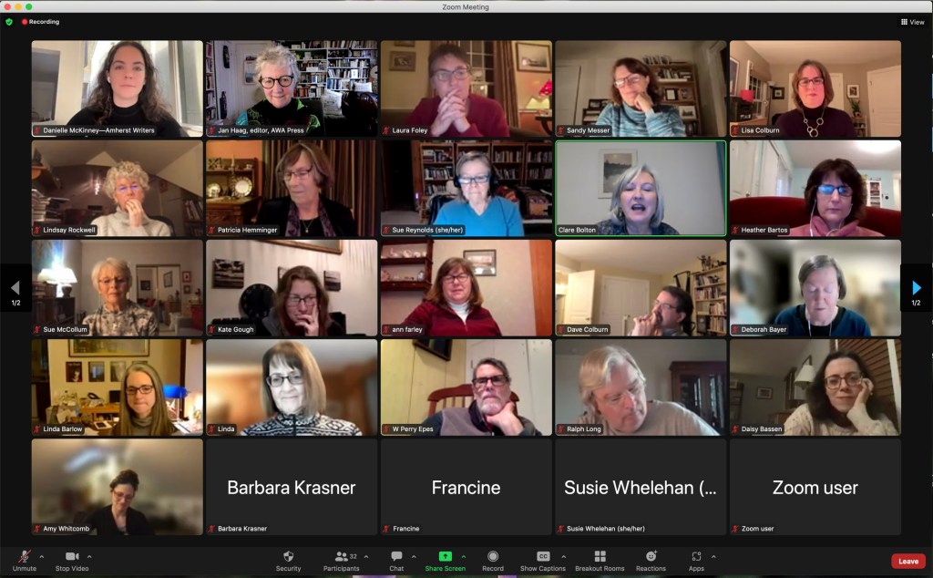 (Special thanks to all the folks published in Peregrine, the Amherst Writers & Artists journal, especially those who read at our two virtual readings, to Danielle McKinney, our MC, and to Sue Reynolds, whose fine leadership and sweet praise will stay with me. And, of course, to AWA founder Pat Schneider, whose work we carry on with great love and much enthusiasm.)