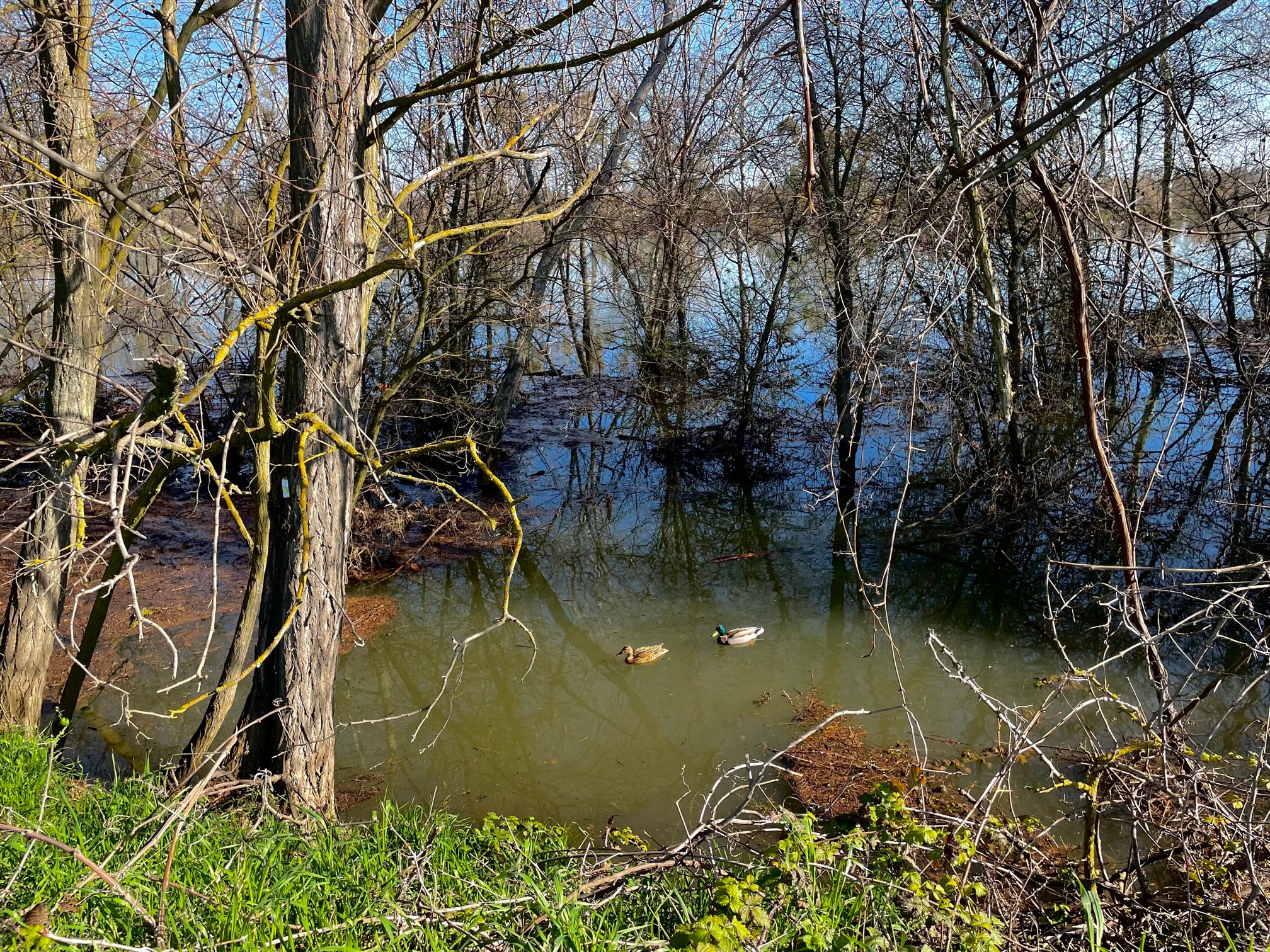 A mallard pair swims between spindly