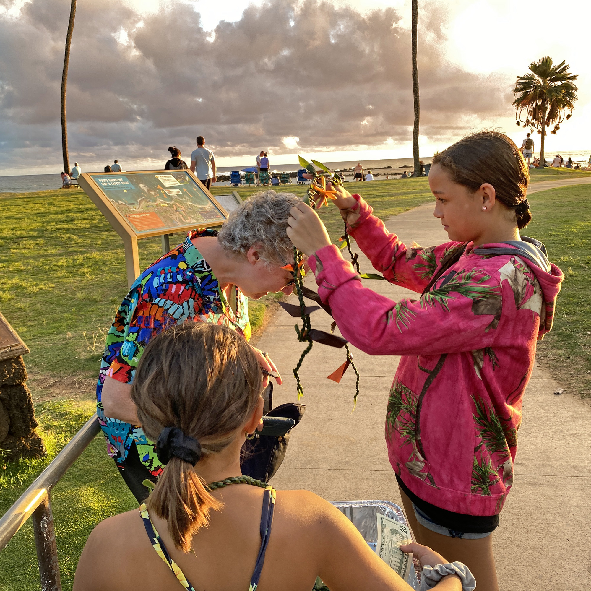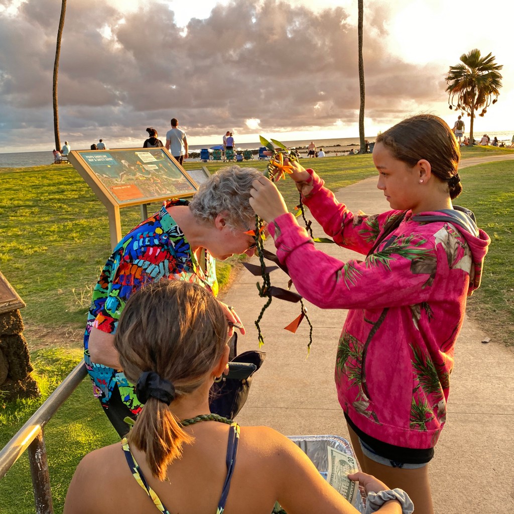 Would you like to buy a lei? the older girl