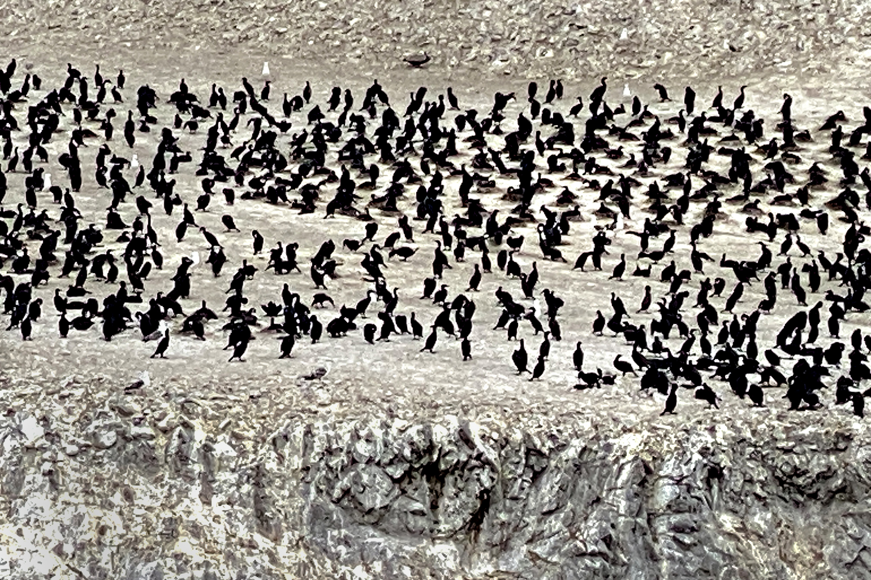 Brandt’s cormorants (top) on Bird Island; (above) brown pelican in flight / Photos: Dick Schmidt