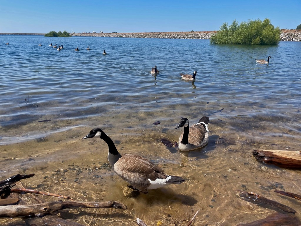 The flotilla of Canada geese looks happy,