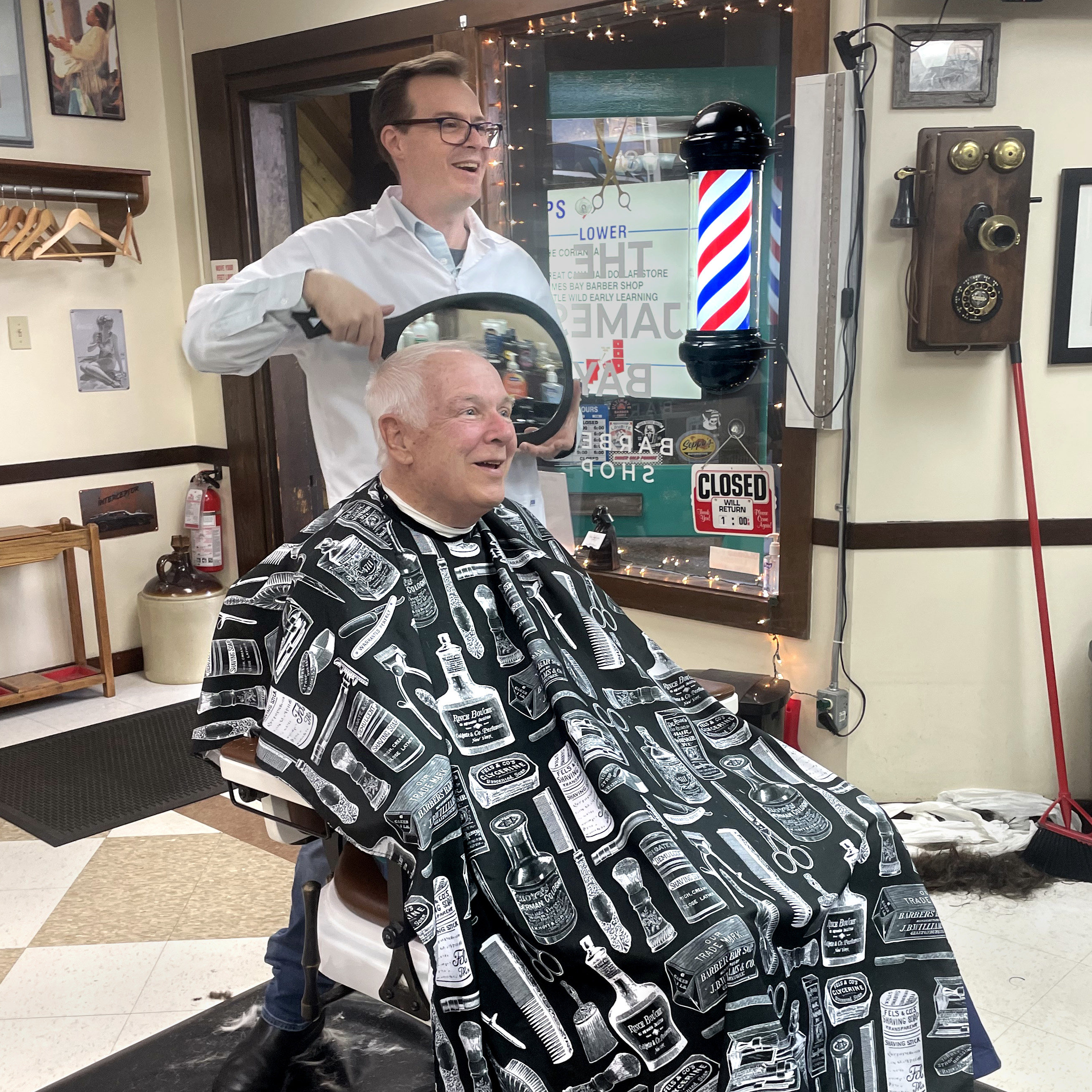 Barber Sean Guinane shows Dick Schmidt his spiffy new haircut, The James Bay Barbershop, Victoria, BC / Photo: Jan Haag
