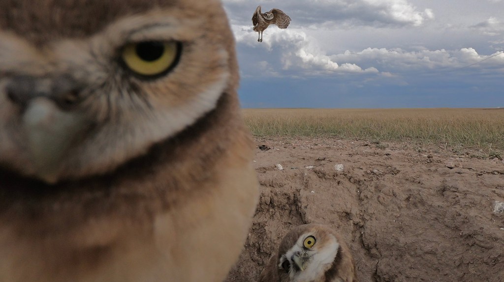 Small, sandy-colored burrowing owls live underground in burrows they’ve dug themselves in grasslands, deserts and other open habitats where they primarily hunt insects and rodents. Wyoming photographer Pete Arnold set up a GoPro camera to shoot at regular intervals on the edge of a nest of burrowing owls near Cheyenne, and, among thousands of images, a trio recorded this memorable selfie on June 28, 2024.