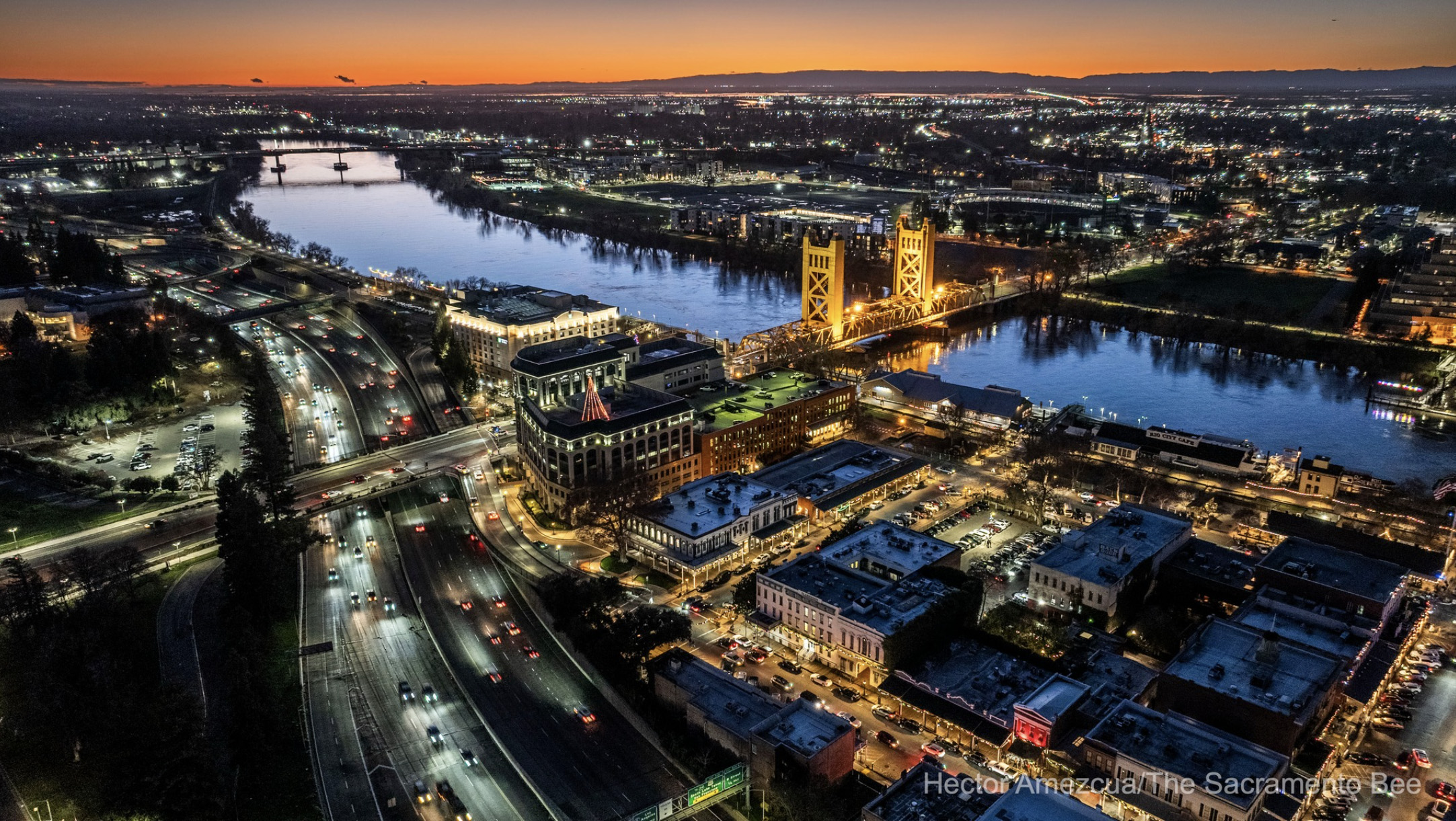 and the Sacramento River into West Sacramento—at sunset on Dec. 27, 2025.)