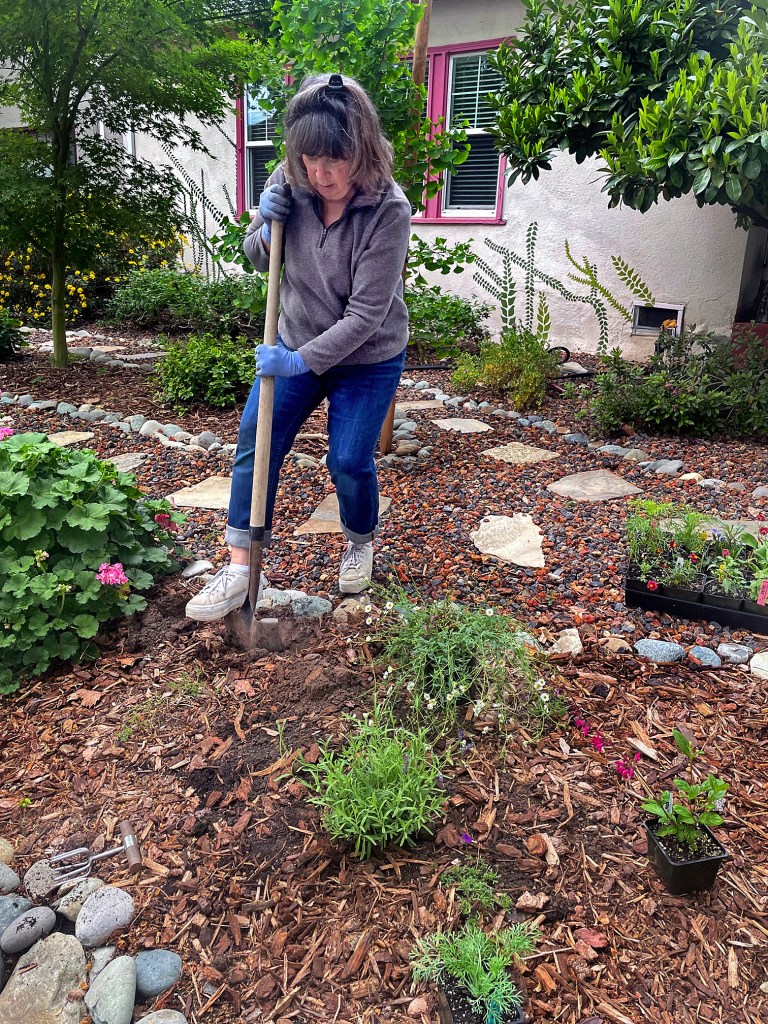 On her knees, patting dirt firmly into place