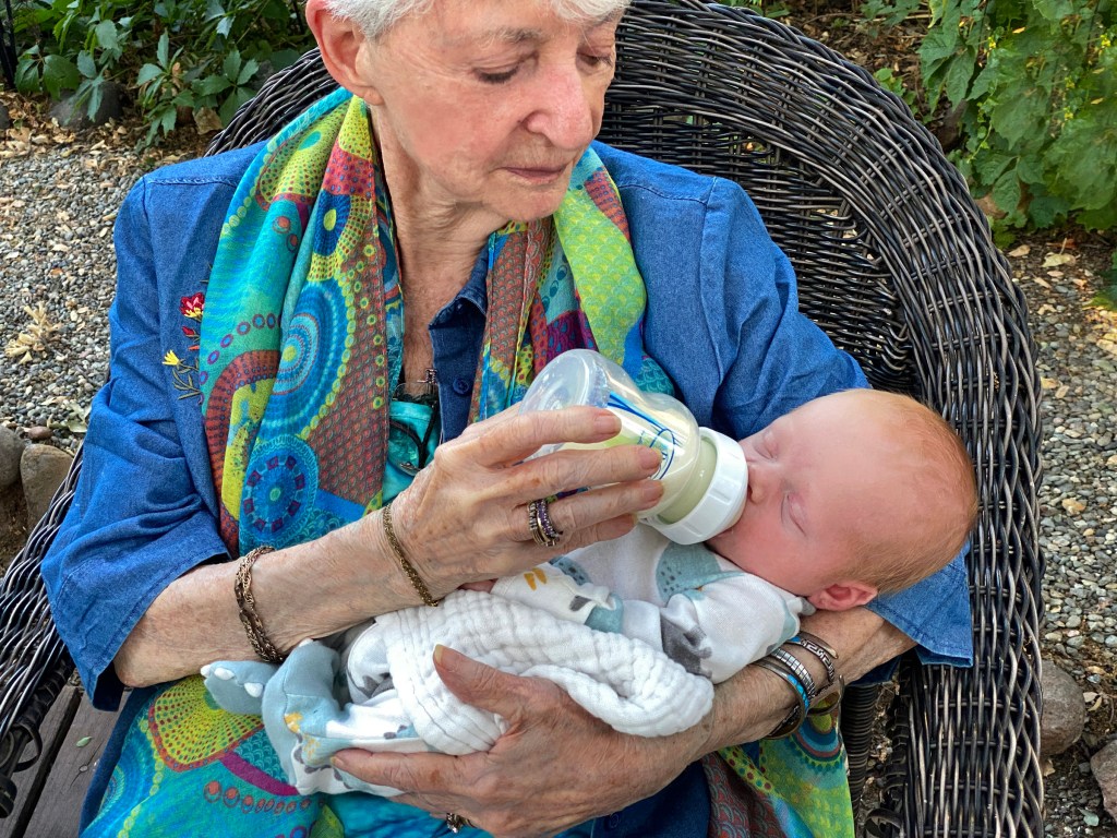 the great aunt taking a turn in between cuddles with his mom and grandma,