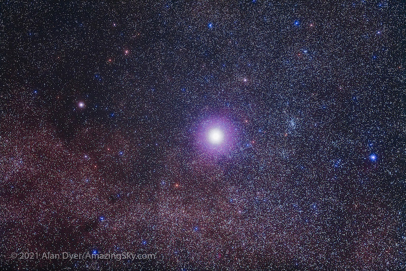 Alpha Centauri, the third-brightest star in the sky, photographed in Coonabarabran, New South Wales, Australia. Across the field, patches of dark interstellar dust clouds obscure stars in our Milky Way galaxy. Image via Alan Dyer/AmazingSKY on earthsky.org.