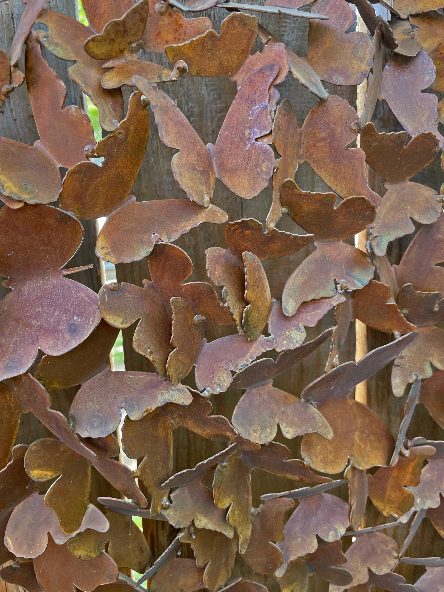 But something stops me, and I backstep to peer closely, discover that the heart is composed of dozens of small, open-winged butterflies, delicately rendered in rusty metal.