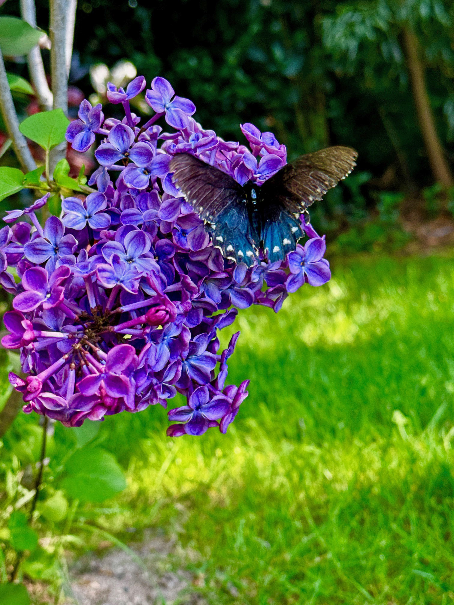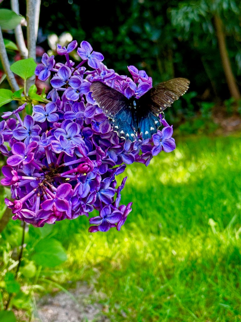 I think she saw me taking pictures of her flowers and had to check on them, too, texts your grandson’s wife. Purple lilac with a blue butterfly. That’s her in a nutshell.